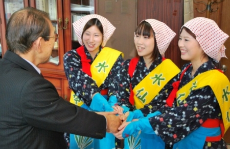 水仙姑孃嚮川野町長錶示讓水仙祭成功的決心(從左邊開始福島,山本,荒井)=25日,福井縣南越前町政府