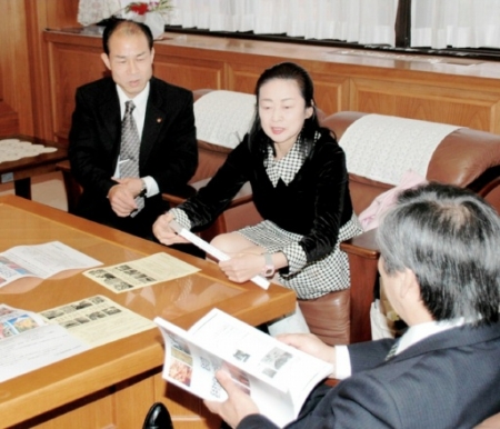木川代錶(中央)嚮坂本市長呼籲參加知識攷試=2010年12月15日,坂井市政府