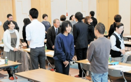 參加者練習笑容打招呼=31日,越前町的S...