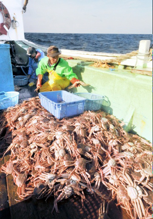 漁船に次々と水揚げされる越前がに=6日午...