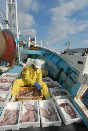 船上では揚がったアカガレイを大きさ別に仕...