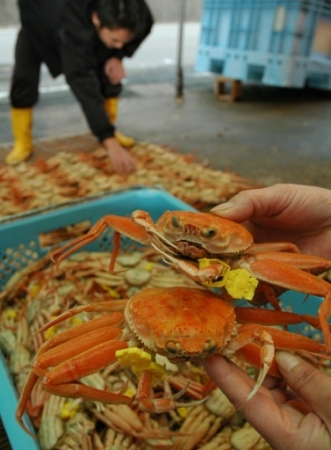 黄色いタグでブランド化が進められているセイコガニ=27日、福井県越前町厨