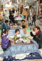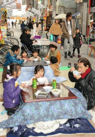 商店街の路上に設けられたこたつに入り、カ...