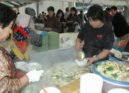 人気を集めた熱々のカニ鍋。水仙まつりでは...