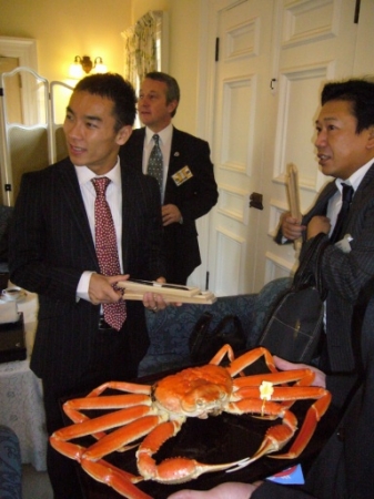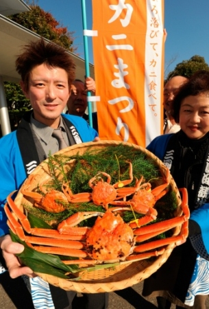 特産のカニを持参し、三国温泉カニまつりへ...
