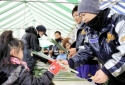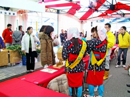 水仙まつり来場者に越前水仙を配る(右から...