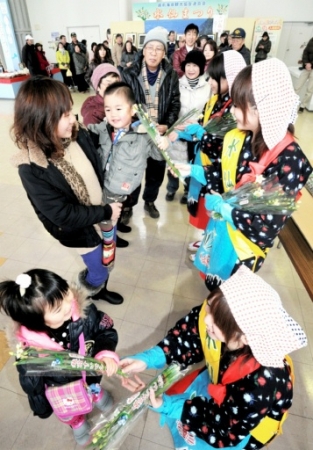 水仙娘(右)から越前水仙を手渡され笑顔を...