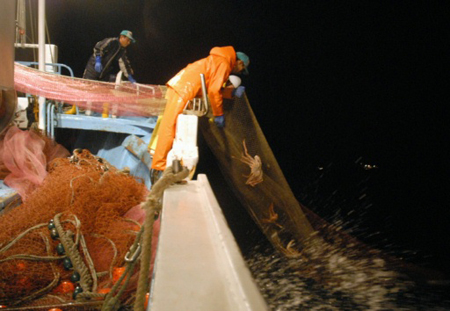 暗闇の中、網にはズワイガニが入り次から次...