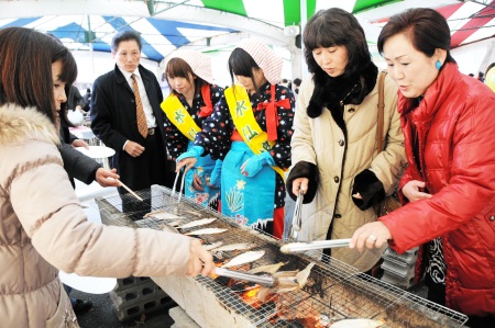 会場で買ったカレイの干物などを炭火で焼い...