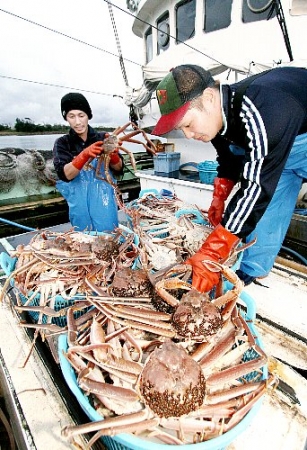 越前がに漁解禁を迎え、トロ箱が次々と船か...