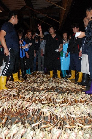 越前がにの初競りの様子=6日午後6時55...