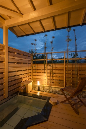 広々とした玄関に足を踏み入れると、「ようこそおいでくださいました」と“看板娘”の美人姉妹がさわやかな笑顔でお出迎え。ゆったりしたロビーで、ナツメ茶をすすりほっこり一息。手入れの行き届いた中庭を眺めながら廊下を進み、客室へ。部屋付き露天風呂(全5室)は、見事に非日常の空間を演出している。好きなときに好きなだけ湯あみを満喫できるのが嬉しい。